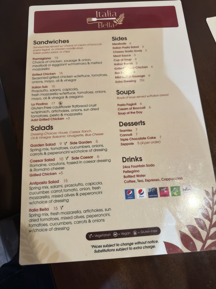 Compliment your meal with their comforting Pasta Fagioli Soup or the rich Cream of Broccoli Soup. Desserts like the luscious Tiramisu and decadent Triple Chocolate Cake round out the menu flawlessly.